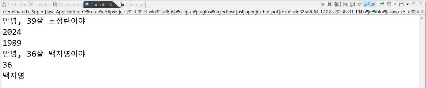 super(age, name); // super() : 부모-자식 관계에서 부모 클래스를 호출하는 예약어 --> 지금의 경우에는 age, name의 두 매개변수가 인수를 각각 받아서 Human 클래스의 명시적 생성자(age와 name을 매개변수로 가진 Human 생성자)를 호출하여 그 안의 코드를 수행시킴!!