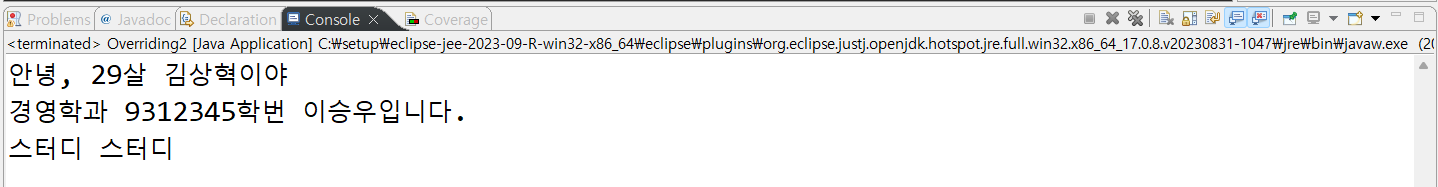 - 개념 : 상위 클래스가 가지고 있는 메서드를 상속 관계의 하위 클래스의 메서드에서 재정의하여 사용하는 것