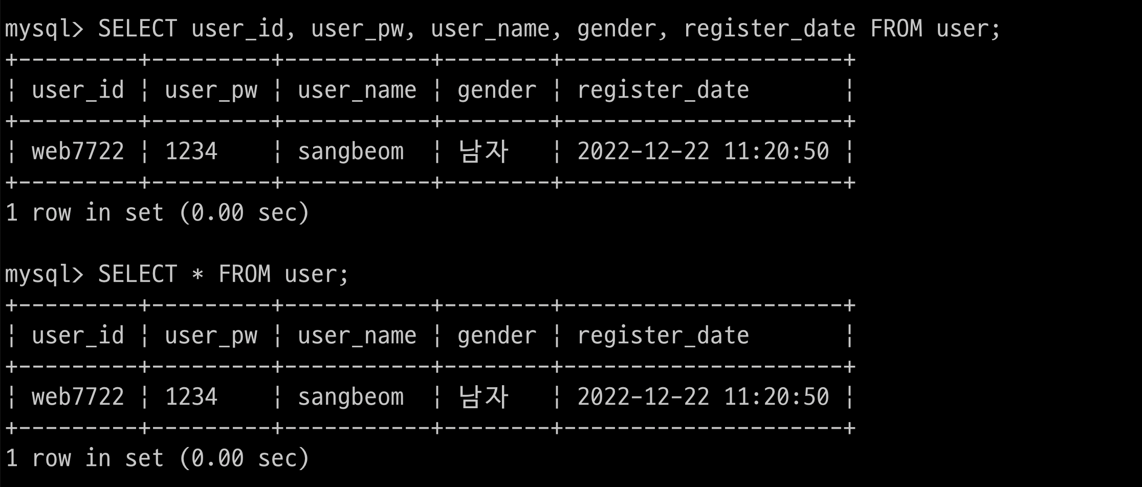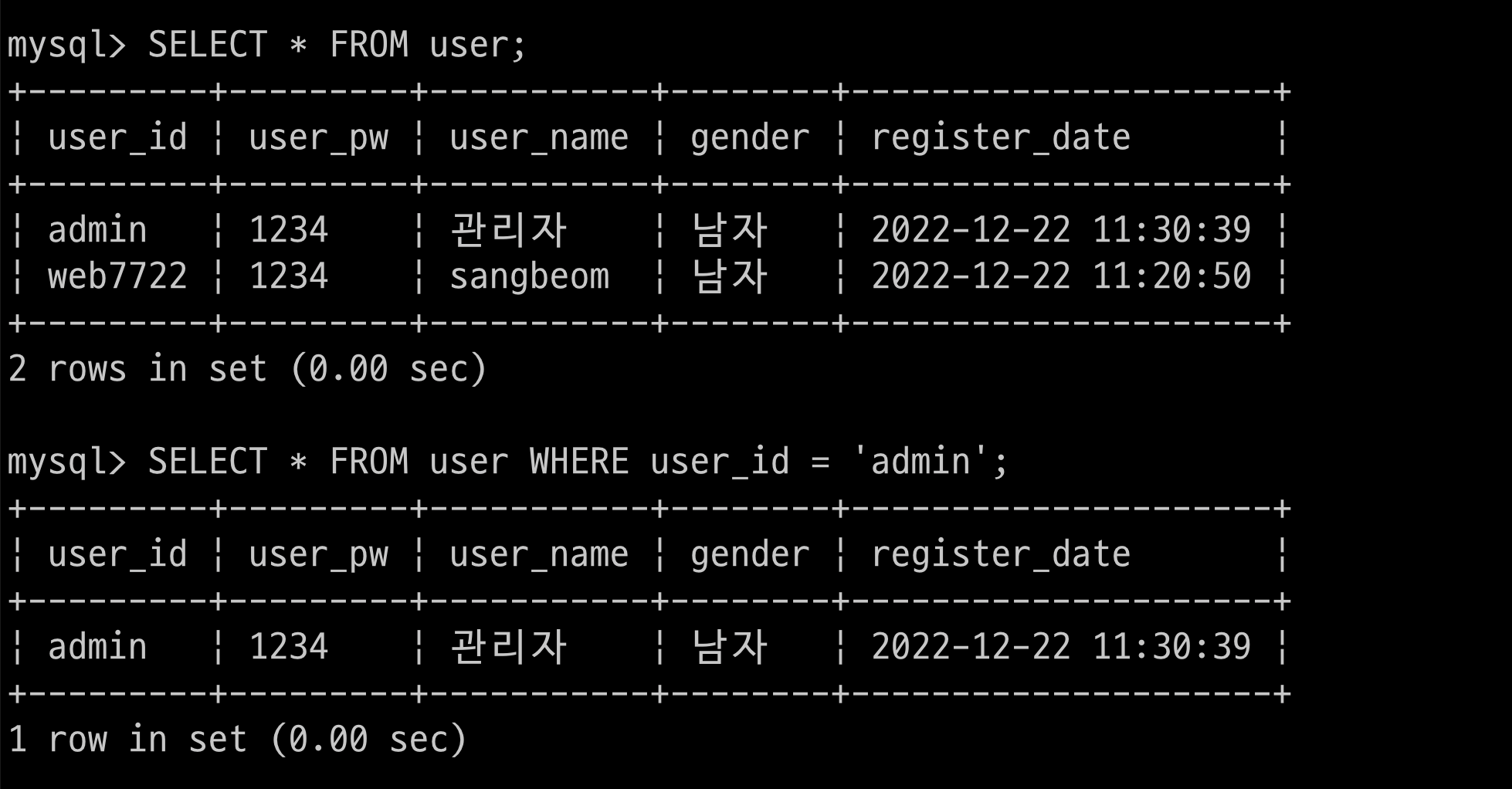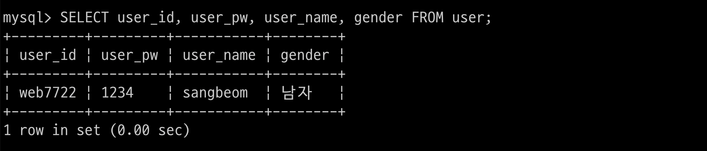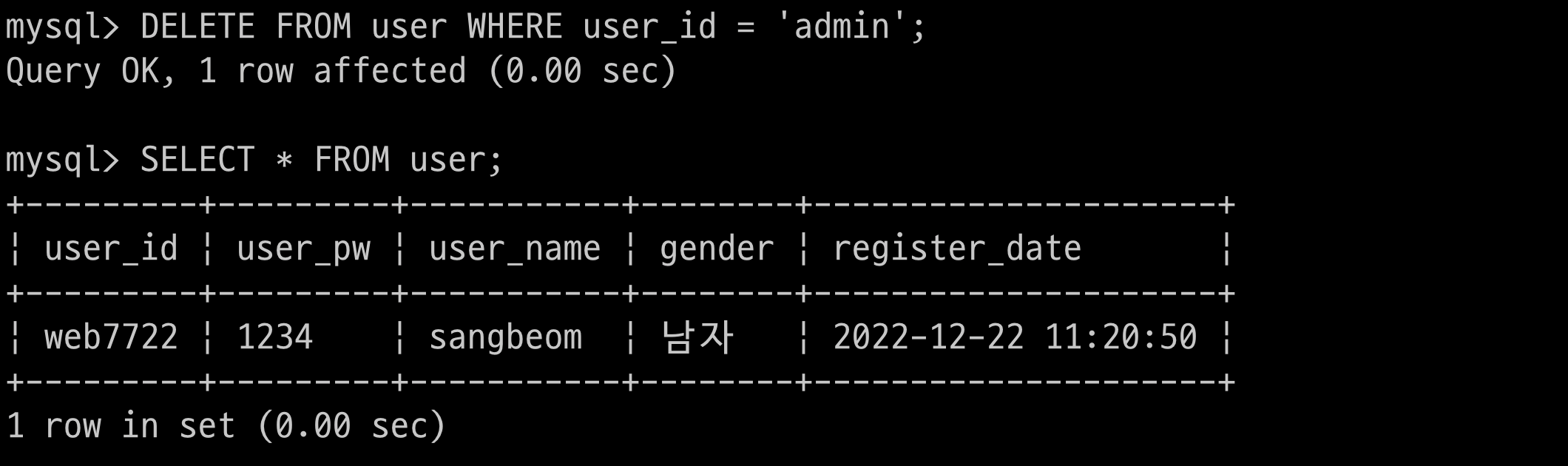 $ > INSERT INTO user(user_id, user_pw, user_name, gender) VALUES('web7722', '1234', 'sangbeom', '남자');