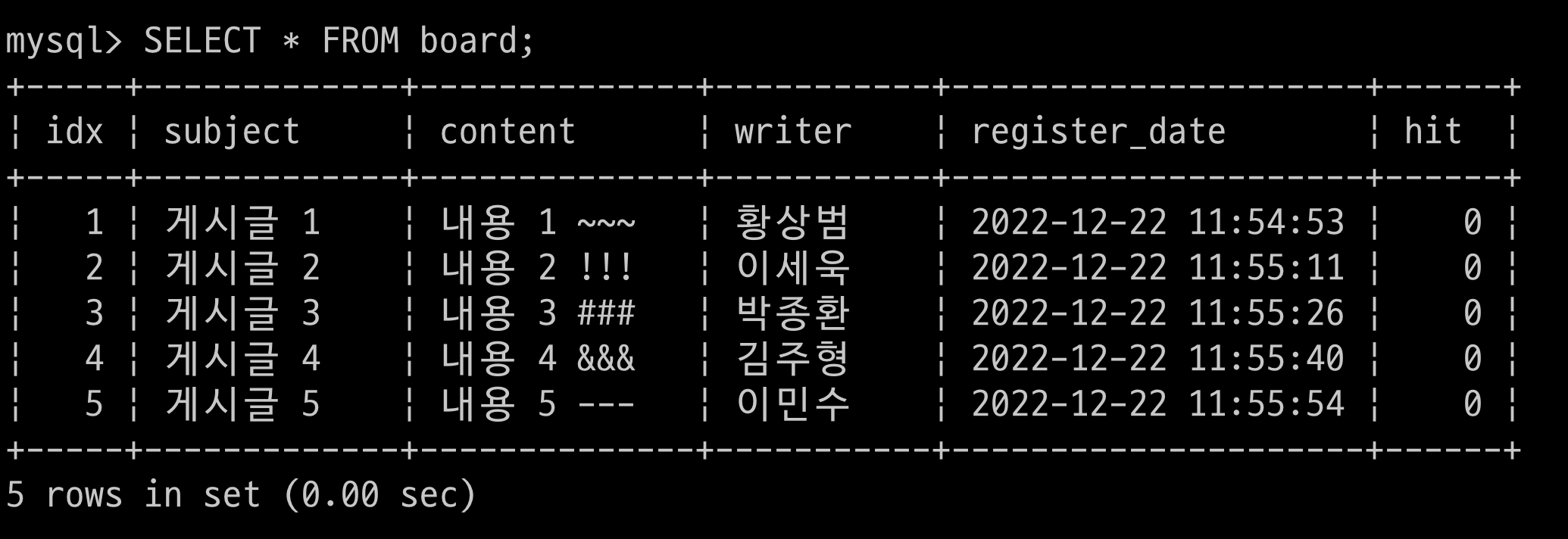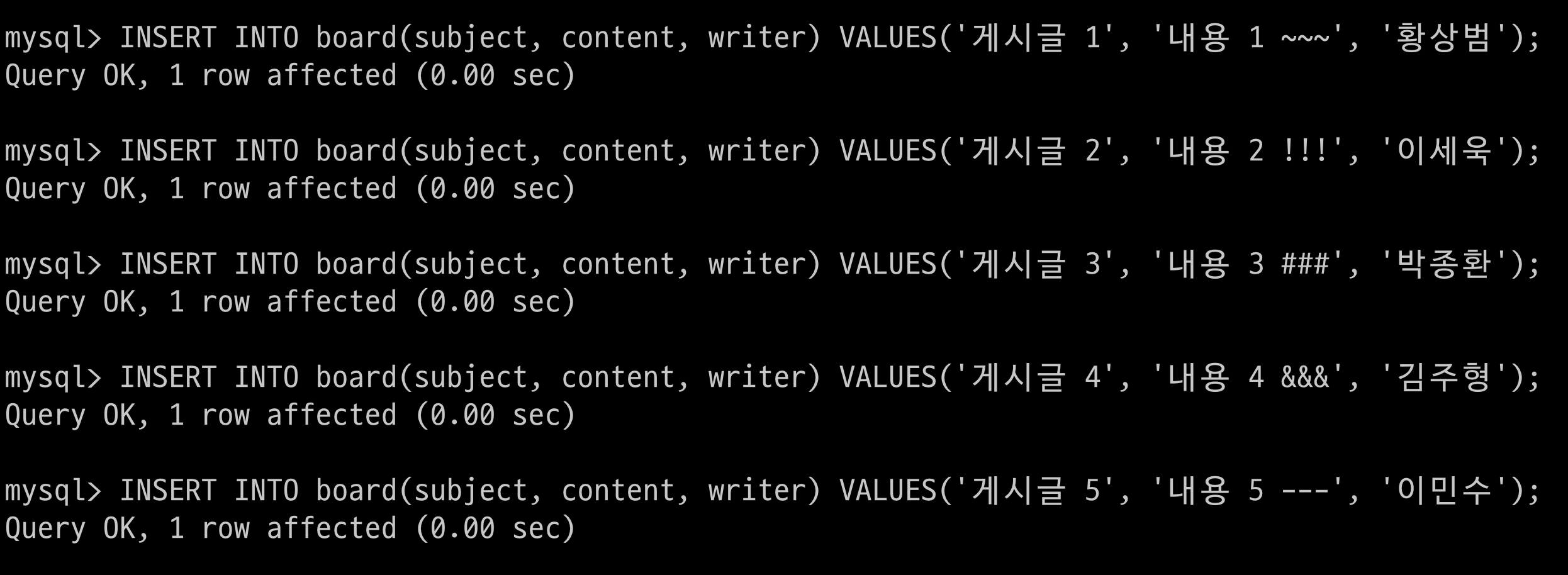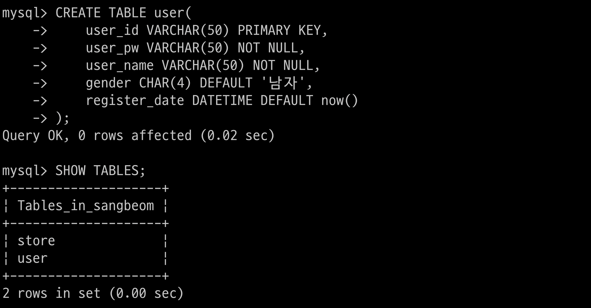 $ > INSERT INTO user(user_id, user_pw, user_name, gender) VALUES('web7722', '1234', 'sangbeom', '남자');