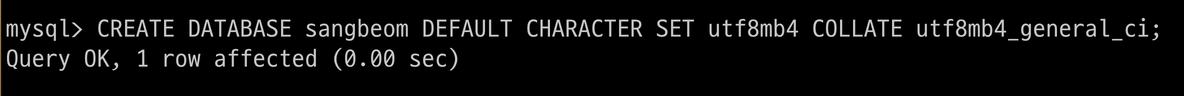 $ > CREATE DATABASE sangbeom DEFAULT CHARACTER SET utf8mb4 COLLATE utf8mb4_general_ci;