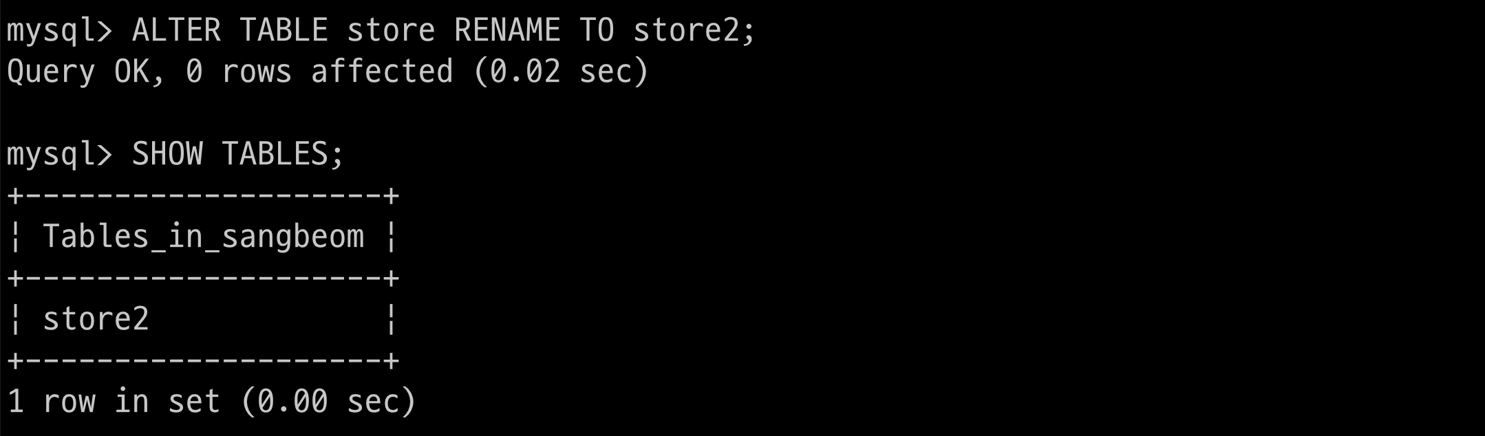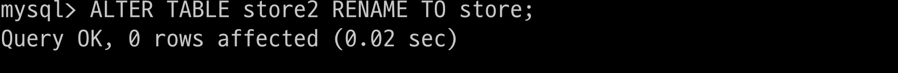 $ > ALTER TABLE store RENAME TO store2;