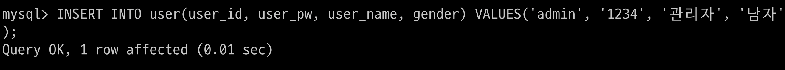 $ > INSERT INTO user(user_id, user_pw, user_name, gender) VALUES('admin', '1234', '관리자', '남자');