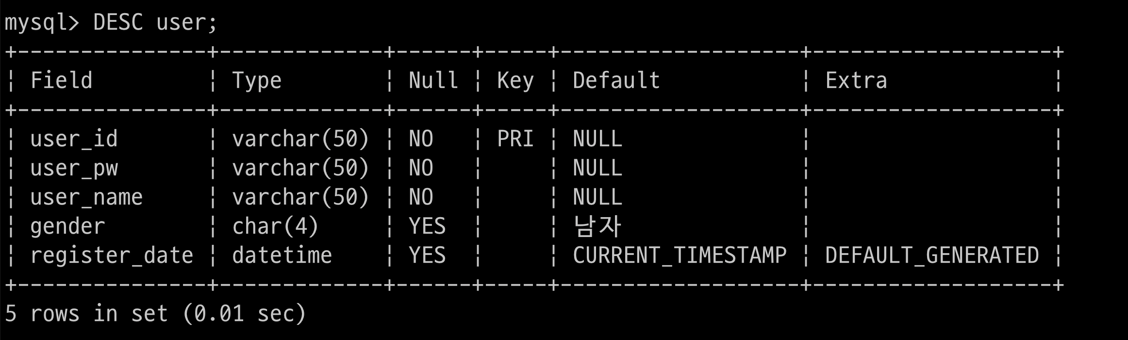 $ > SELECT user_id, user_pw, user_name, gender, register_date FROM user;