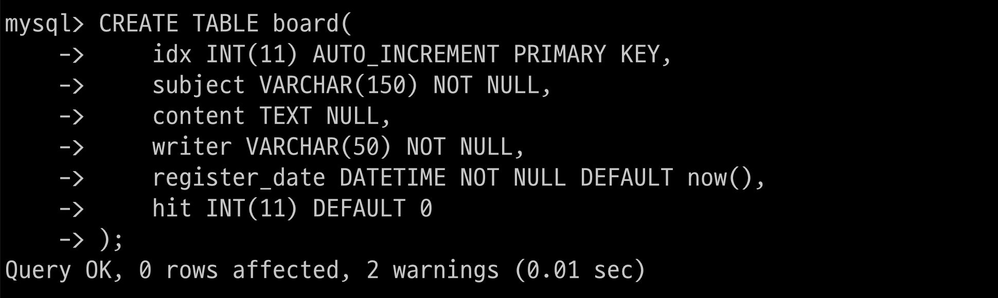 $ > CREATE TABLE user(