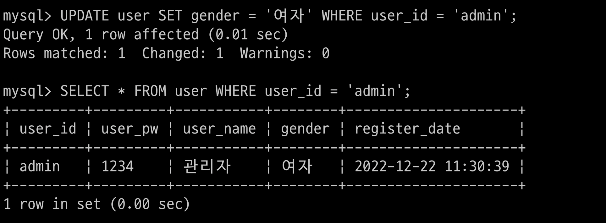 $ > UPDATE user SET gender = '여자' WHERE user_id = 'admin';